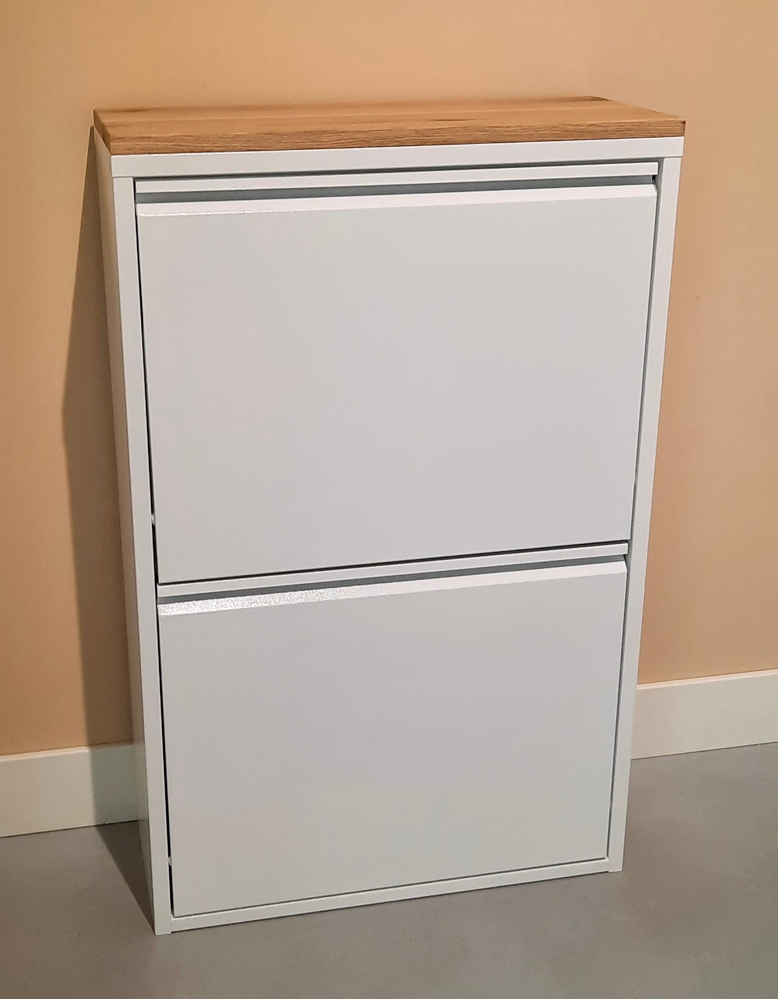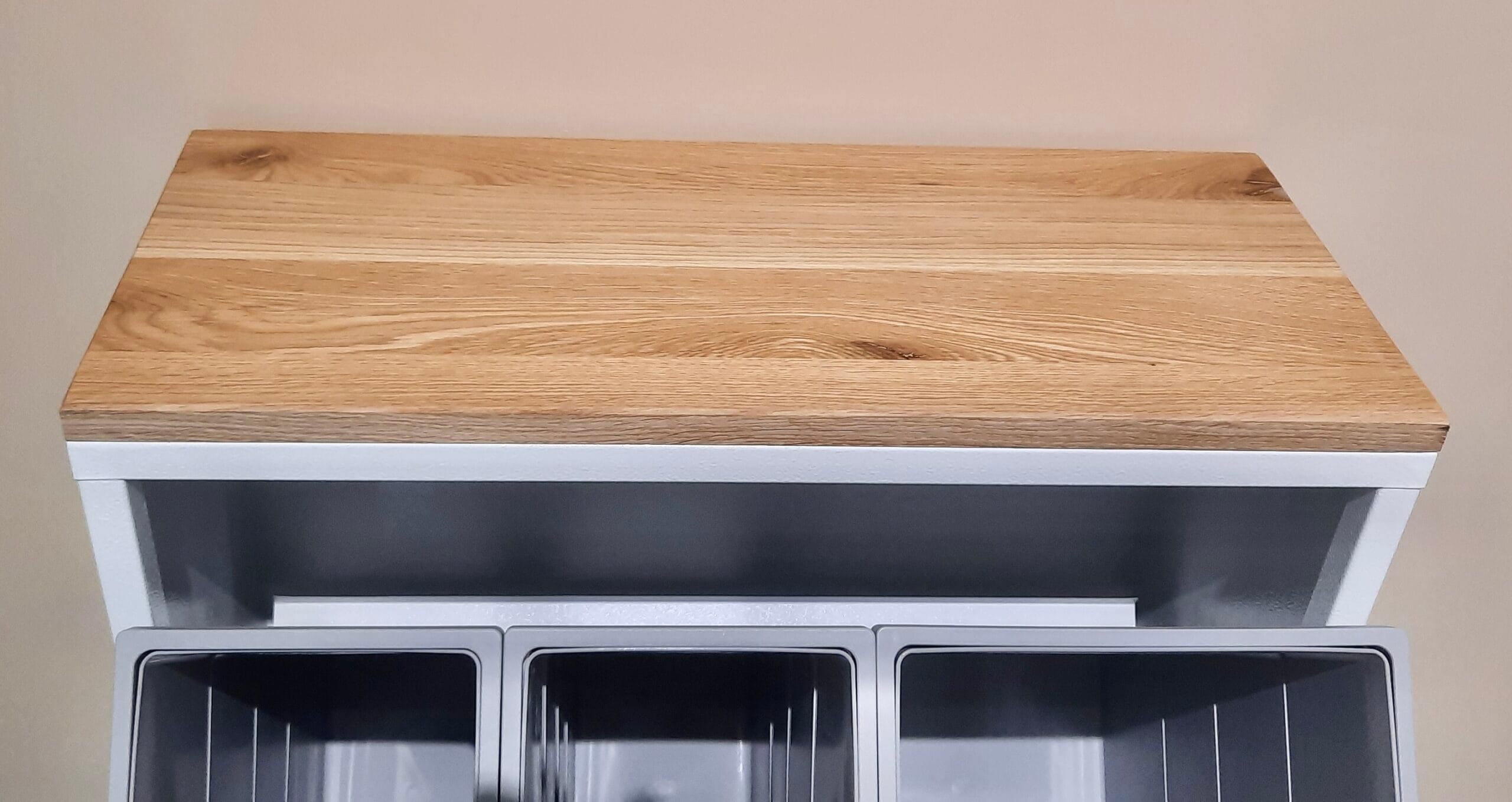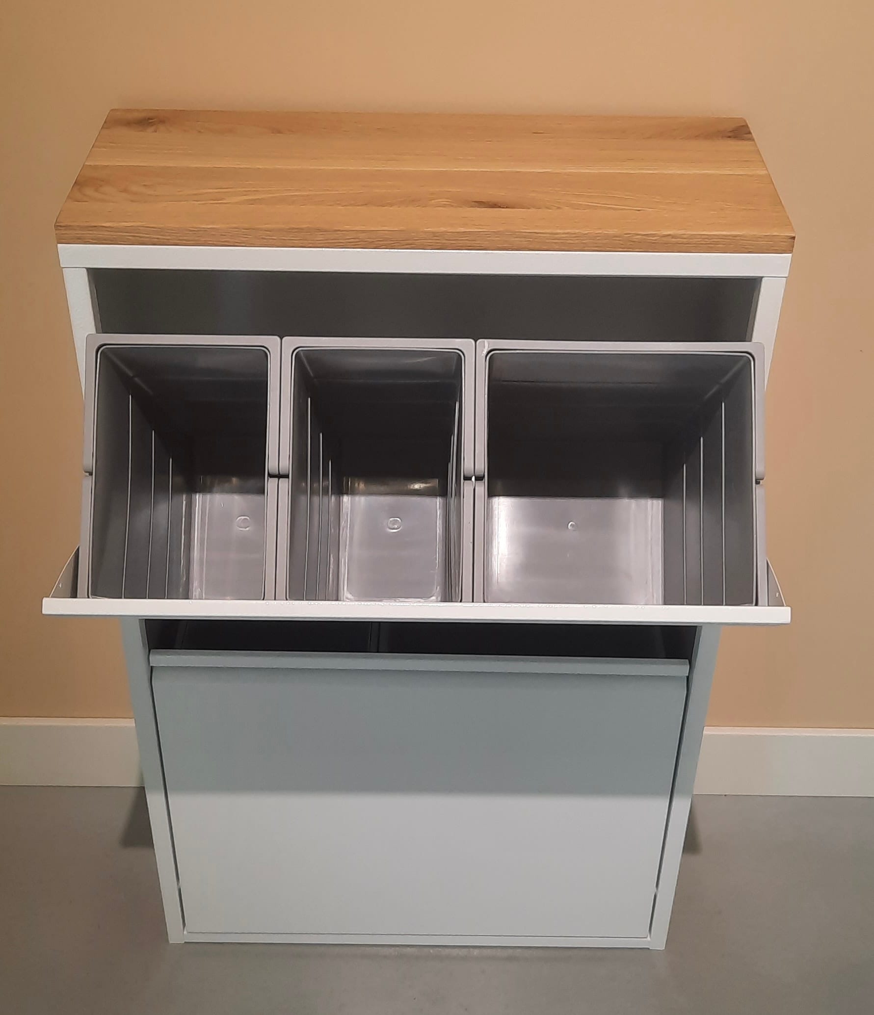 De vuilnisbak is gemaakt van een metalen omkasting met een wit gemoffelde poedercoating. Op de bovenzijde is afgewerkt met een massief eiken paneel voorzien van invisible lak dus het hout is beschermd. Het eiken paneel geeft de prullenbak een chique uitstraling.